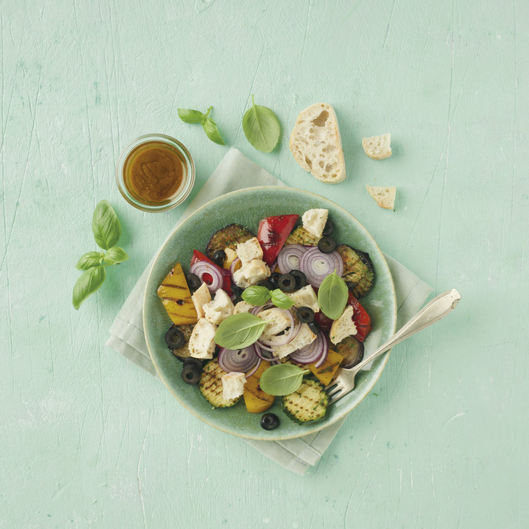 Die Zwiebel schälen und in feine Ringe schneiden. Das abgekühlte Grillgemüse in eine große Schüssel geben, die Zwiebelringe und Basilikumblätter hinzufügen. Oliven nach Belieben in Streifen schneiden oder im Ganzen zum Gemüse dazufügen. Die gerösteten Brotwürfel über das Grillgemüse streuen.