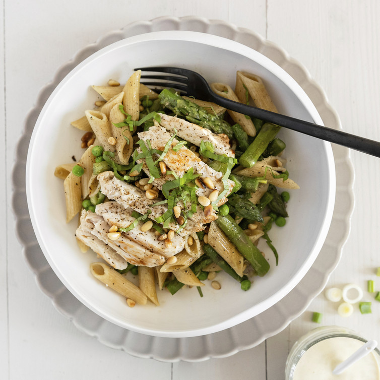 In einem Topf 3 Liter Wasser zum Kochen bringen. Wasser reichlich salzen und Penne nach Packungsanleitung zubereiten. In der Zwischenzeit grünen Spargel vom holzigen Ende befreien und Spargelstangen in ca. 4 cm große Stücke schneiden. In den letzten 2 Minuten Kochzeit die Spargelstücke sowie die tiefgefrorenen jungen Erbsen in den Topf zu der Pasta geben und zu Ende garen. Wasser abschütten, Penne und Gemüse vorsichtig kalt abbrausen und abtropfen lassen.