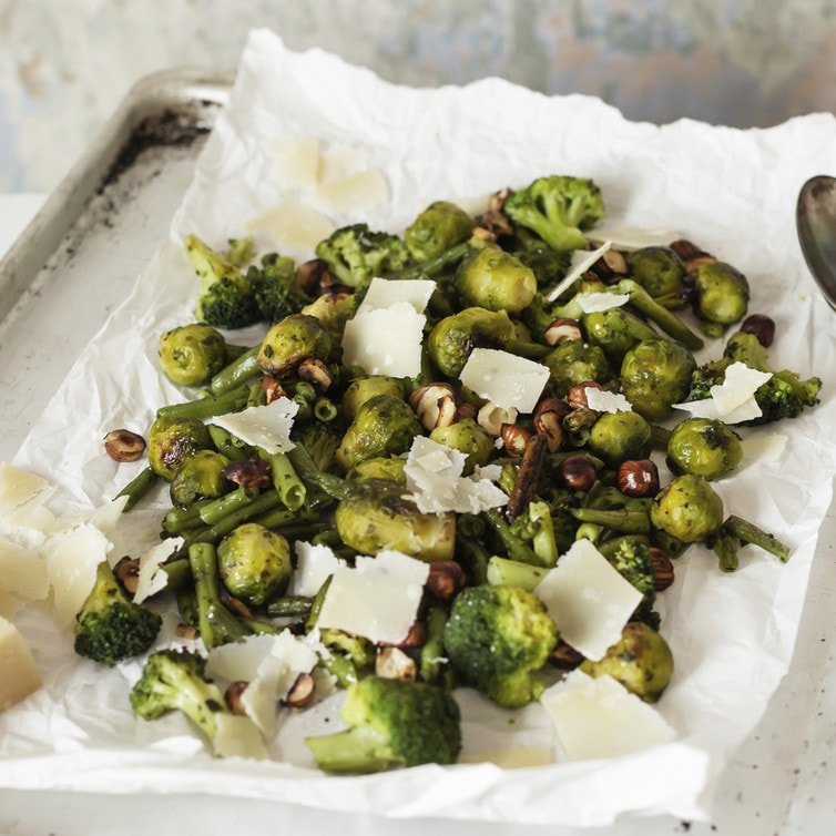 Grünes Ofengemüse mit Parmesan-Haselnussspänen