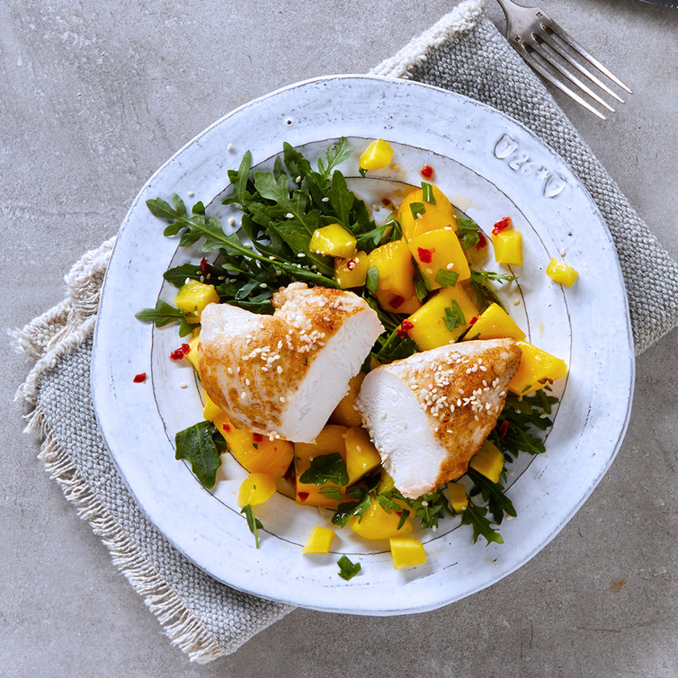 Pro Portion ein Bett aus Mango Salat auf Tellermitte setzen. Darauf das Hähnchenbrustfilet anrichten und mit der restlichen Rauke bestreut servieren.