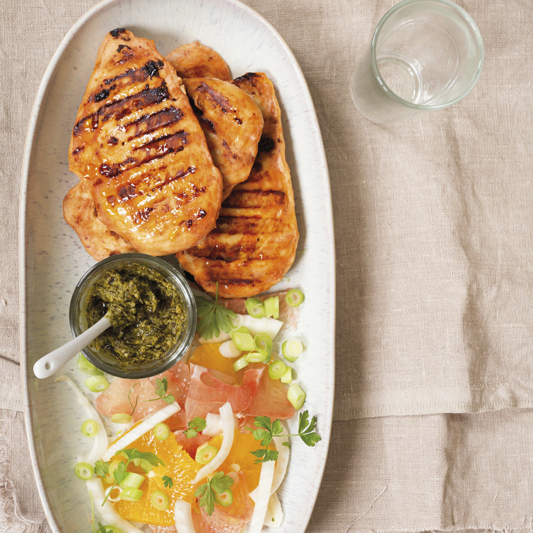 Servieren Sie die marinierten Hähnchen-Minutensteaks zusammen mit dem Orangen-Fenchel-Salat und dem grünen Pesto auf einer Servierplatte.