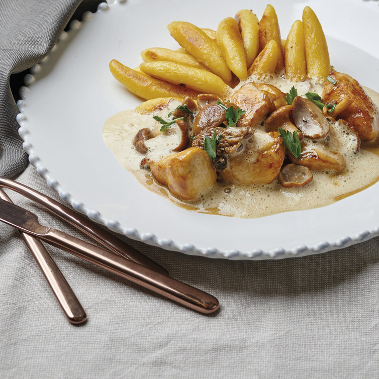 Hähnchenbrust mit Waldpilzcrème und Schupfnudeln