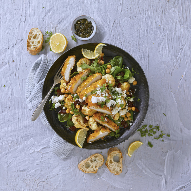 Salat auf Teller verteilen und mit Hähnchenschnitzel-Streifen belegen. Zerbröckelten Feta-Käse und gehackte Petersilie darüberstreuen.