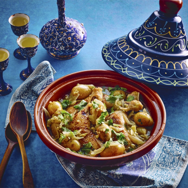 - 9. - 25 Minuten vor Ende der Garzeit geben Sie die Oliven, die Kartoffeln und den frischen Koriander mit in die Tajine.