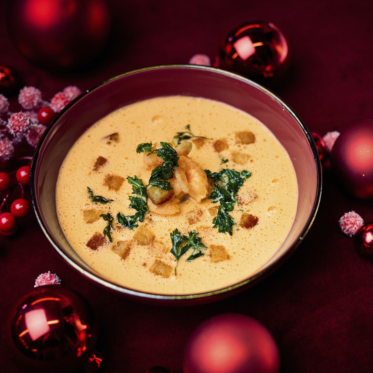 Ein festlicher Auftakt für das Weihnachtsmenü: feine Hummercremesuppe, verfeinert nach einem Rezept von Johann Lafer. Nur noch mit dem Topping vollenden – und genießen wie im Restaurant.