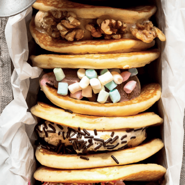 Vouw de Pancakes dubbel zoals een sandwich en bestrooi ze met de decoratie!
