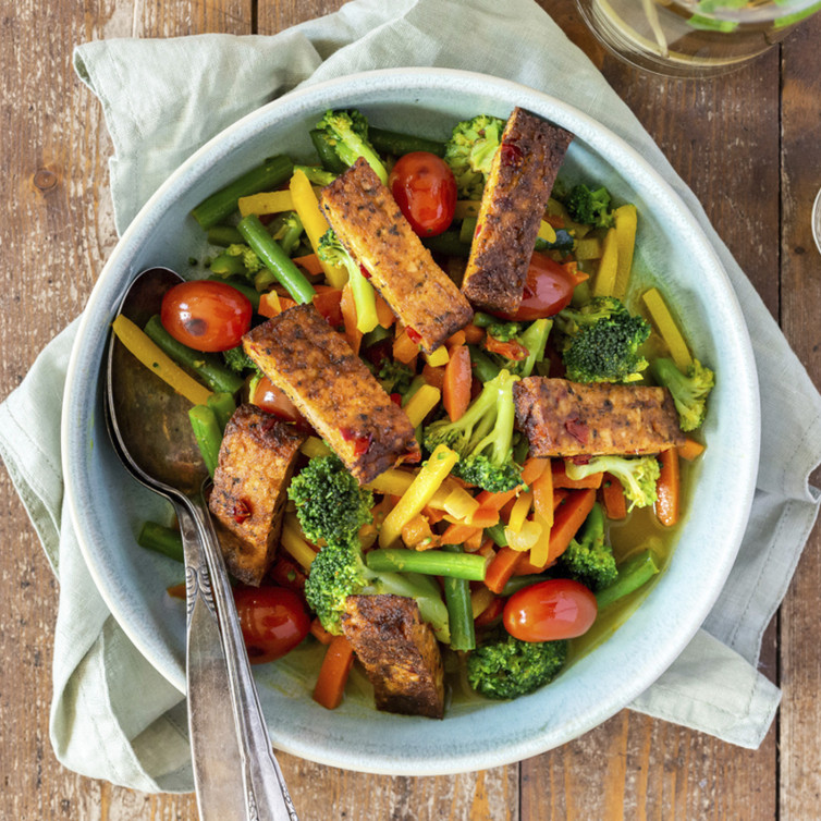 Nun das Gemüse in die Pfanne geben und unter gelegentlichem Rühren grillen. Kurz vor dem Ende die Kirschtomaten und den Saitan dazu geben und zu Ende grillen. Ggf. mit Curry, Salz und Pfeffer nachwürzen.