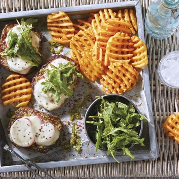 Was de rucola, droog en snijd of pluk in kleine stukjes. Marineer met een beetje olie, balsamicoazijn, zout en peper. Garneer de hamburgers met de rucola en serveer de aardappelwafels ernaast.