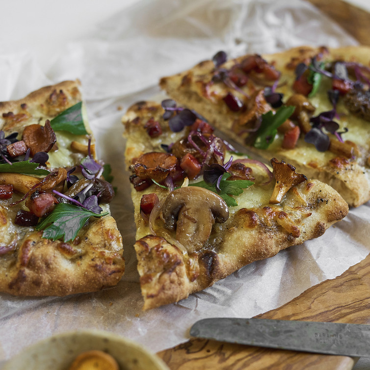 Johanns Pizza mit Pilzen und Speck aufgelafert (von Johann Lafer)
