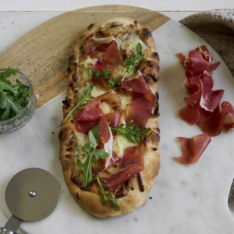 Johanns Pizza mit Rucola und Vulcanoschinken aufgelafert (von Johann Lafer)
