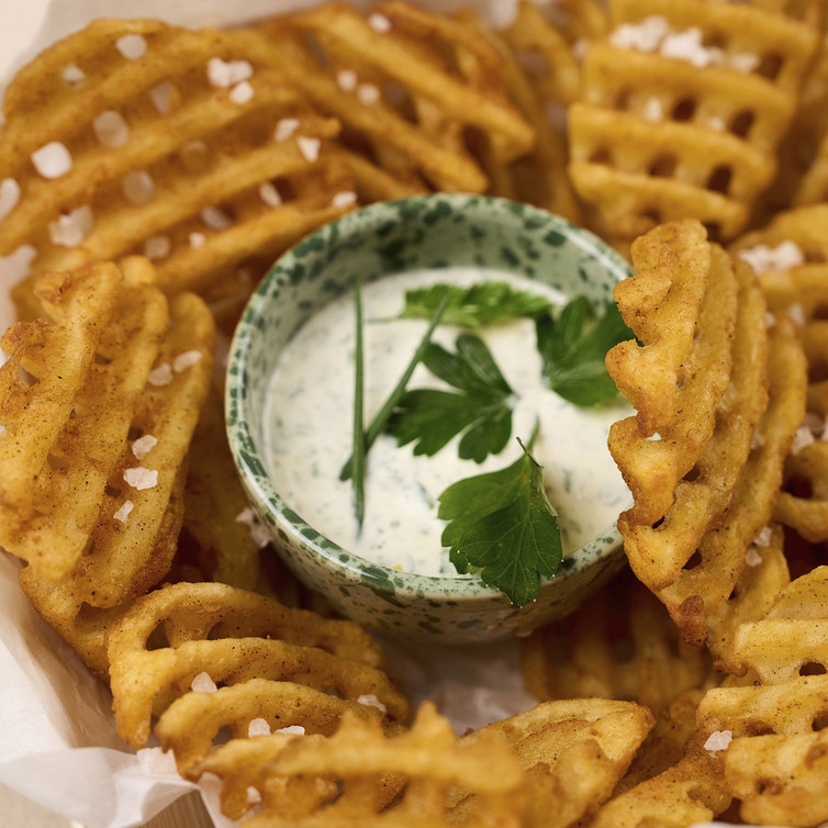 Die knusprigen Kartoffel-Gitter zusammen mit dem frisch zubereiteten Kräuterdip auf einem Teller anrichten und genießen.
