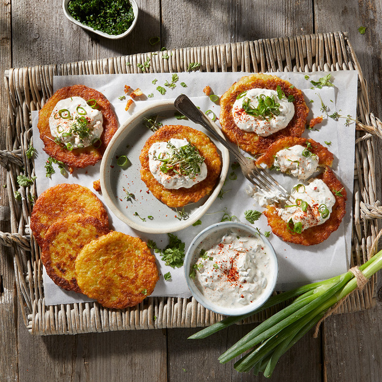 Reibekuchen mit Kräuterschmand auf Tellern anrichten und servieren.