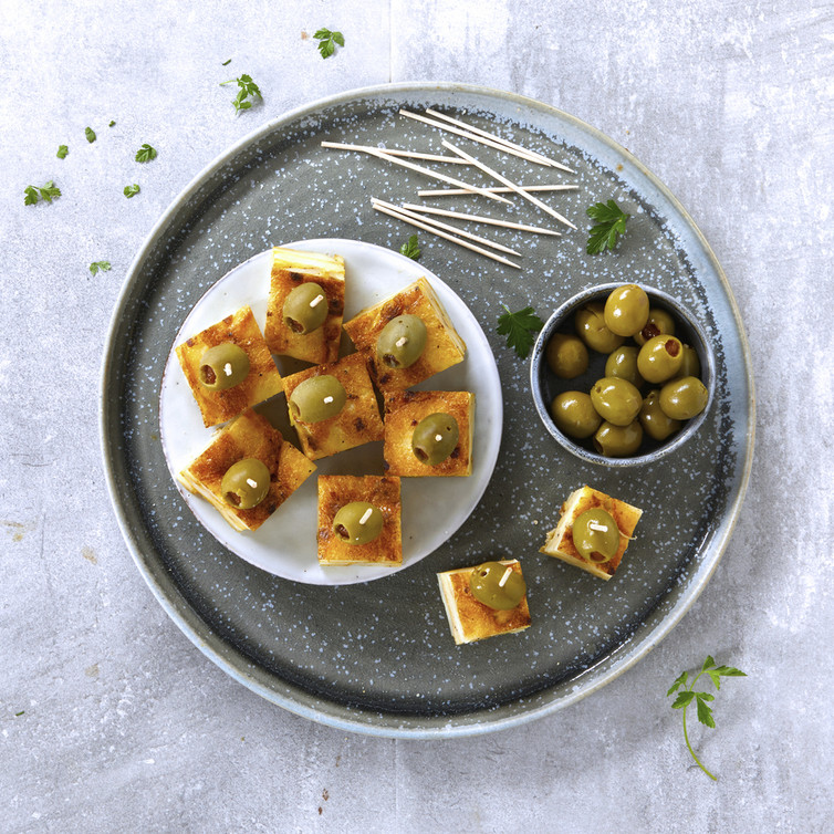 In einer Pfanne etwas Olivenöl stark erhitzen, die Tortillamasse in die Pfanne geben und bei mittlerer Temperatur 2 Minuten stocken lassen. Einen Teller auf die gefüllte Pfanne legen und diese samt Inhalt umdrehen, sodass die Tortilla auf dem Teller liegt. Dann die Tortilla in die Pfanne gleiten lassen und nochmal 1 Minute braten. Tortilla in Stücke schneiden, auf jedes Stück eine gefüllte Olive setzen und auf kleinen Desserttellern servieren.