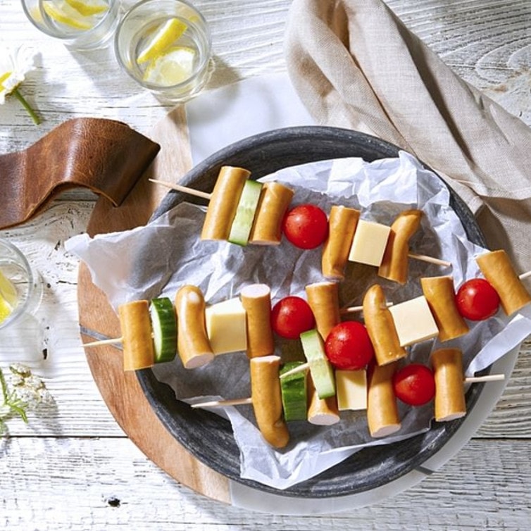 Snijd de worstjes in stukjes van ca. 5 cm. Rijg afwisselend worst, kaasblokje, cherrytomaatje en plakje komkommer aan de spiesen.
