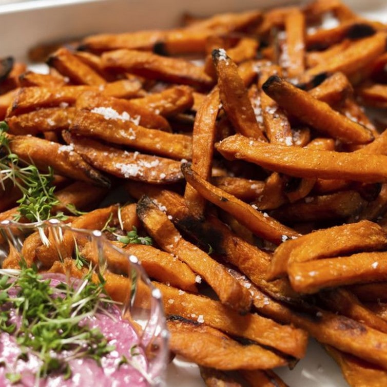 Knapperige zoete aardappelfriet met rode biet en kikkererwtencrème