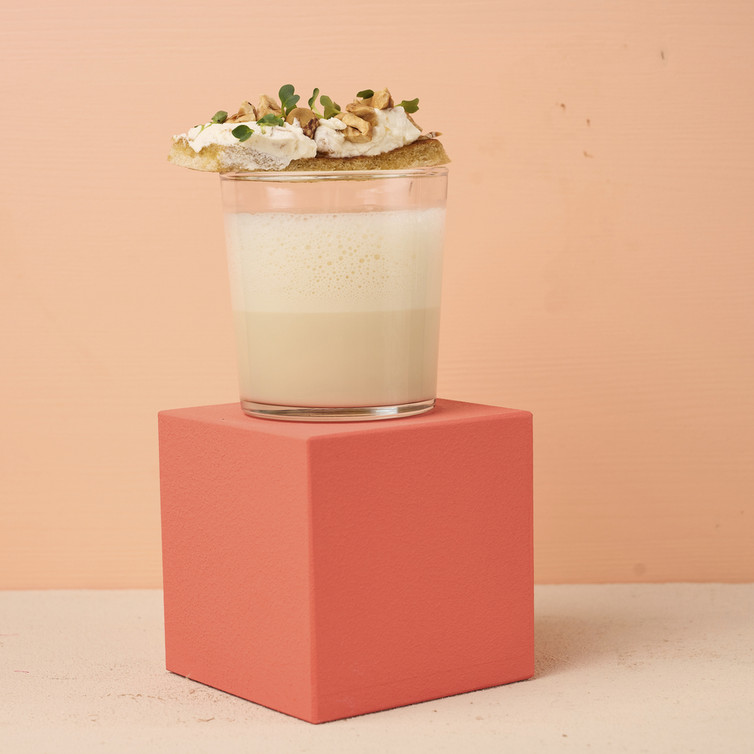 Die Suppe in Gläsern servieren. Das Toastbrot mit dem Frischkäse bestreichen, geröstete Haselnüsse darüberstreuen und mit Salz sowie Pfeffer würzen. Anschließend auf das Glas legen und mit Kresseblättchen garnieren.