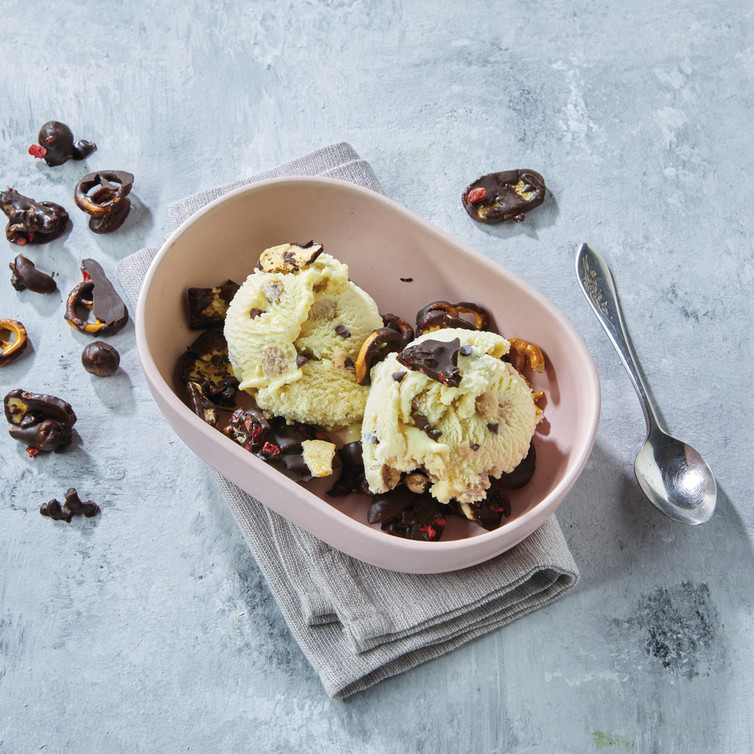 Eis in große Bowls portionieren und mit Crunchi-Topping dekorieren. Reste des Crunchi-Toppings in Schraubdeckelgläser aufbewahren.