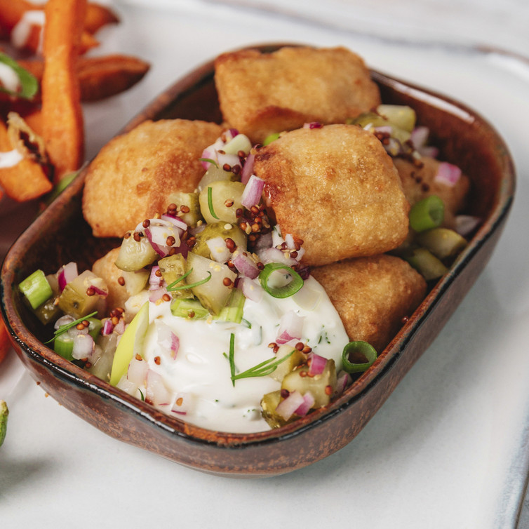 Knusprige Kibbelinge mit Dillmayo, Gurkenrelish und Frühlingszwiebeln