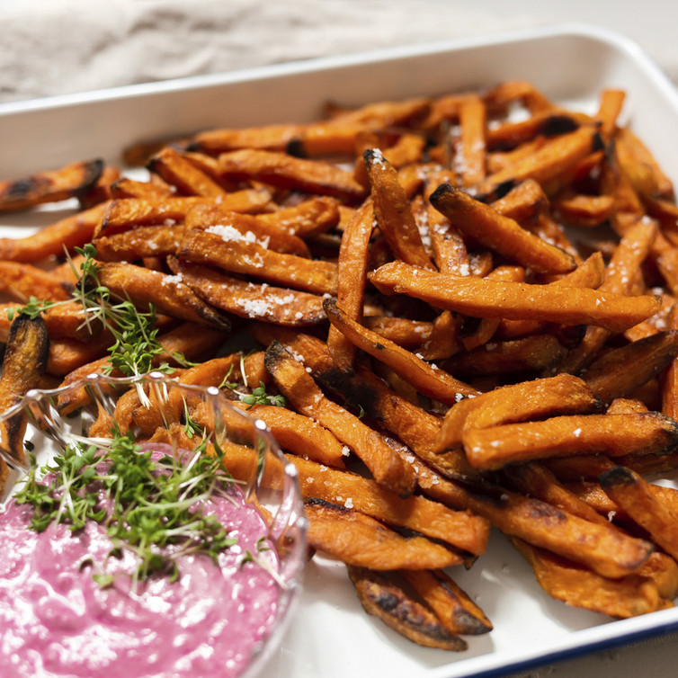 Knusprige Süßkartoffelsticks mit rote Beete-Kichererbsen-Creme