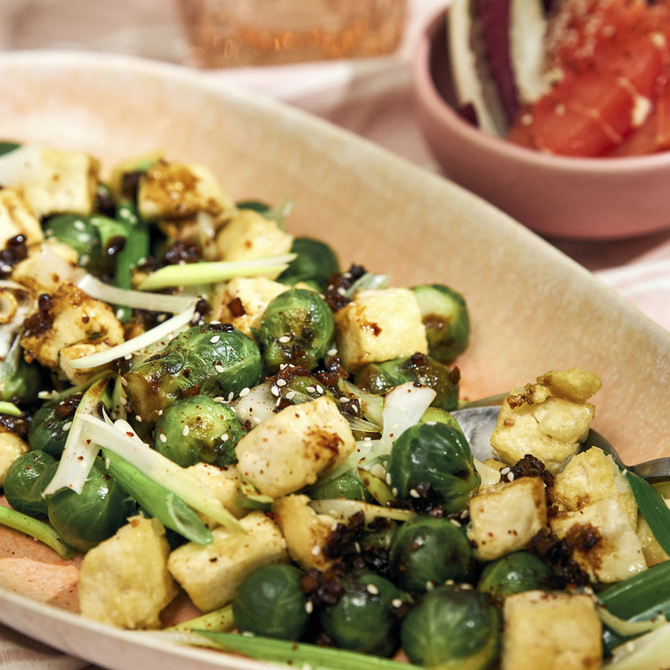 Knuspriger Tofu mit Rosenkohl & Asia-Sauce