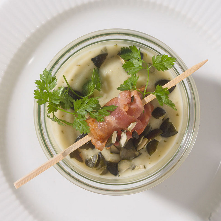 Die Suppe in Gläser füllen, mit den Bacon Locken und den Kürbiskernen dekorieren.