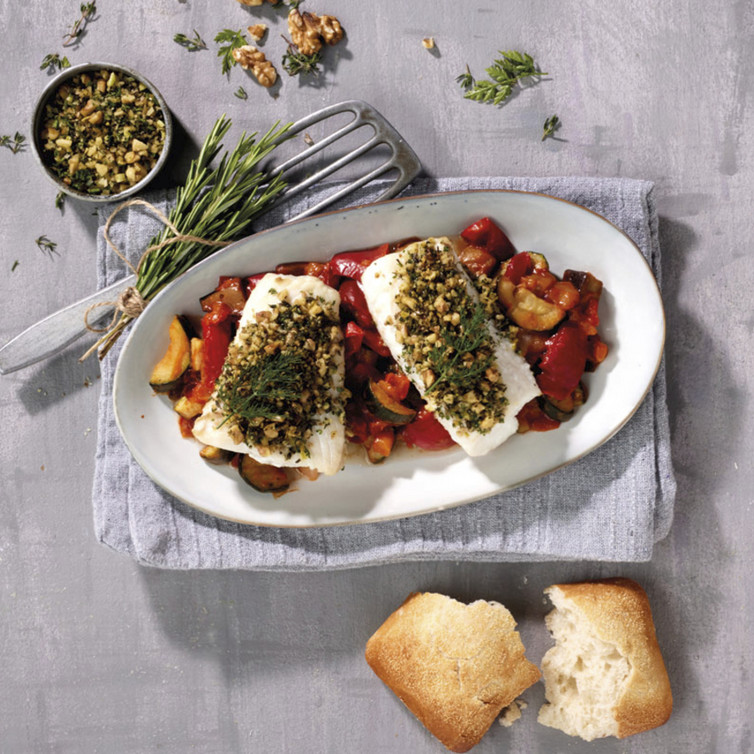 Passende Auflaufform mit 1 EL Olivenöl auspinseln und die trocken getupften Kabeljau Rückenfilets einlegen. Vorbereitete Kräutermasse auf dem Fisch verteilen und im Backofen ca. 30 Minuten backen.
