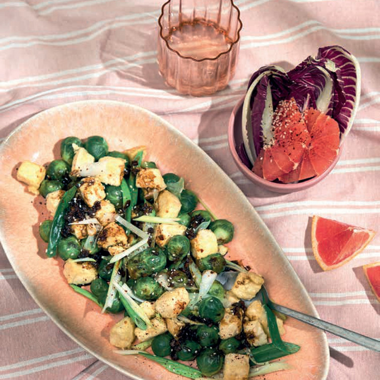 Krokante tofu met spruitjes en Aziatische saus