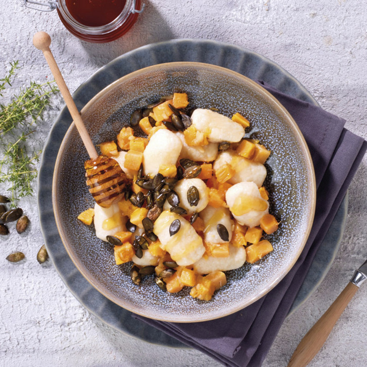 Gnocchi vorsichtig abgießen und direkt unter das Kürbisgemüse heben. Vor dem Servieren jede Portion mit flüssigem Honig beträufeln und mit gerösteten Kürbiskernen bestreuen.