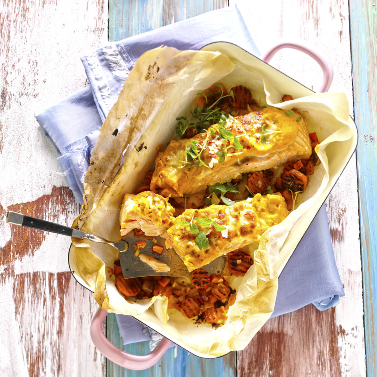 In eine ausgefettete Form die Lachsfilets legen, leicht salzen und pfeffern und mit der Kürbis- Karottenmasse bestreichen. Den Käse darüber streuen.