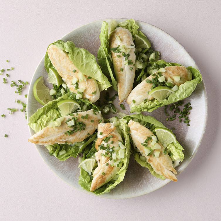 Die Salatblätter in einer flachen Form nebeneinanderlegen. Jeweils eine abgekühlte Hähnchen-Filetspitze darauflegen, mit Gurkenrelish toppen und mit Meersalzflocken und Schnittlauchröllchen bestreuen.