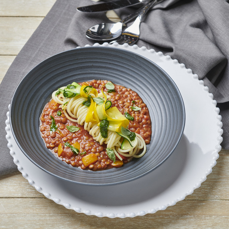 Linsen-Bolognese mit Zucchini & Basilikum-Minz-Pesto