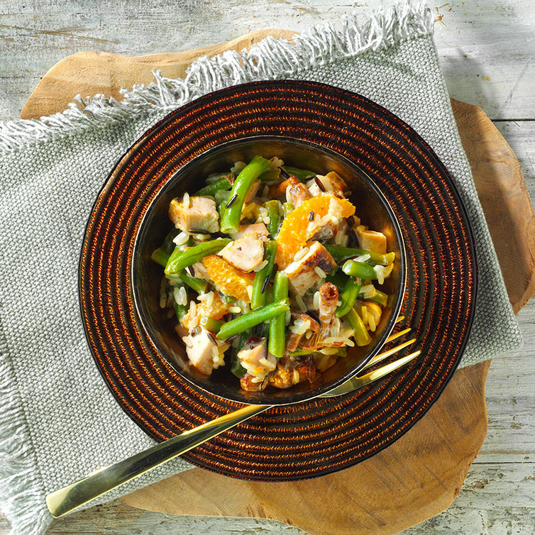 Snijd de kip in kleine blokjes en meng met de rijst, bonen, cantharellen, sinaasappels (een paar partjes apart houden voor garnering) en meng de dressing er voorzichtig door. Leg op borden en serveer met partjes sinaasappel en kruiden.