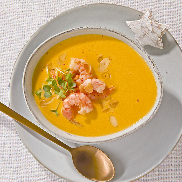Mandel-Riesengarnelen an Möhren-Ingwersuppe