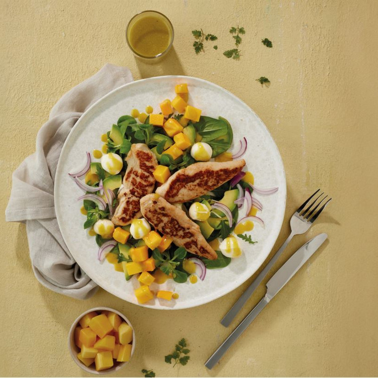 Meng alle ingrediënten voor de dressing zorgvuldig en breng op smaak met peper en zout. Verdeel de sla gelijkmatig over de borden en leg de mangoblokjes, avocadopartjes en de kipfiletpuntjes erop. Leg de mozzarellabolletjes en de uienringen er decoratief tussen en besprenkel alles rijkelijk met de bereide dressing. Serveer indien gewenst met brood.