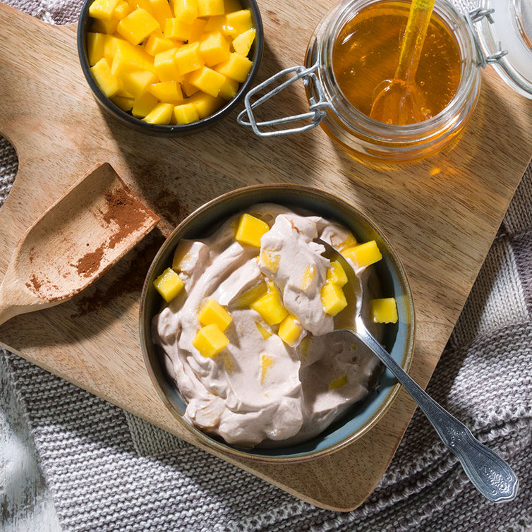 Den Schmand mit dem Kakaopulver verrühren und mit dem Honig nach Geschmack abschmecken.