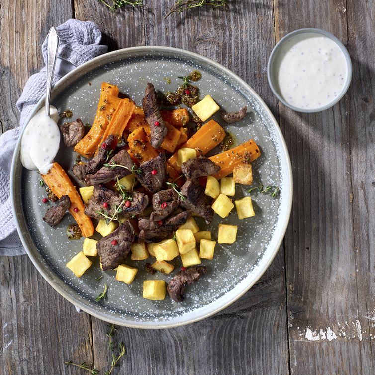 Mariniertes Rindergeschnetzeltes mit Ofenkarotten, Butter-Kartoffelwürfeln & Senfcreme
