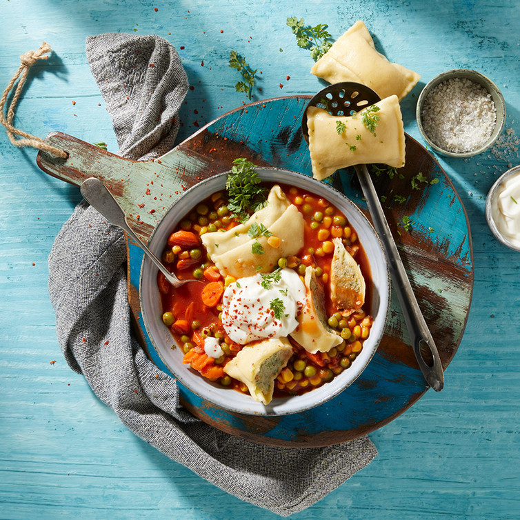Die Suppe mit Salz, frischem Pfeffer, Chili- und Paprikapulver abschmecken und mit Maultasche servieren.
