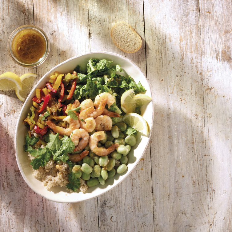 Verdeel de salade en quinoa gelijkmatig over 4 kommen. Schik de geblancheerde tuinbonen, gamba's en paprikareepjes in groepjes naast de salade en quinoa. Garneer met partjes citroen en korianderblaadjes. Druppel de dressing naar smaak over de kommen of serveer apart.