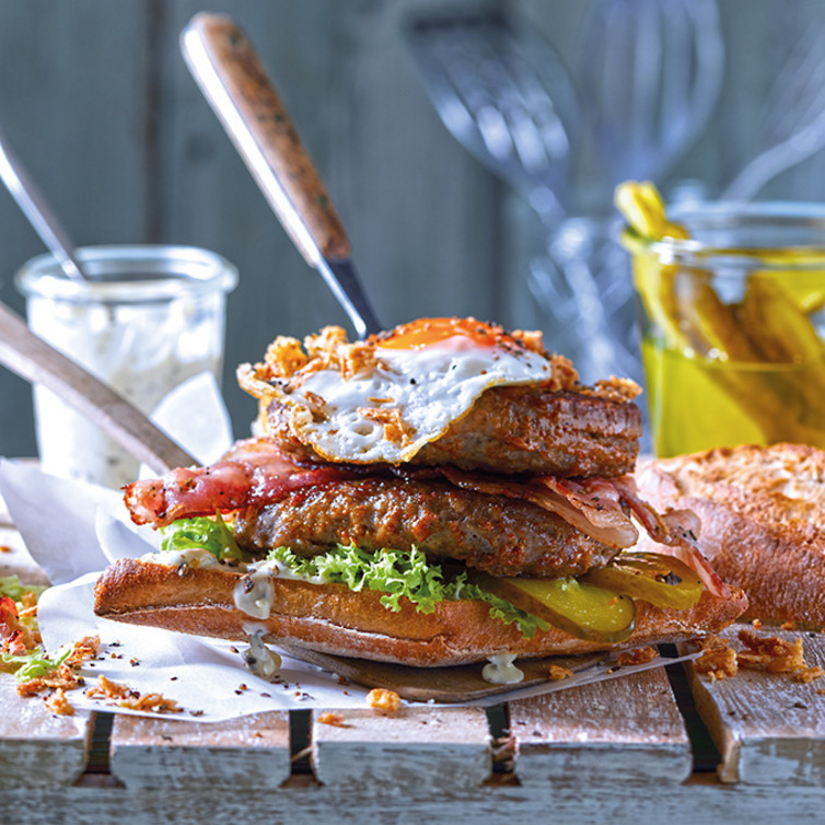 De klassieke hamburger, maar dan anders... Met twee sappige Runderhamburgers, knapperige bacon en verfijnd met een gebakken eitje. Zo'n hoge hamburger schept hoge verwachtingen!