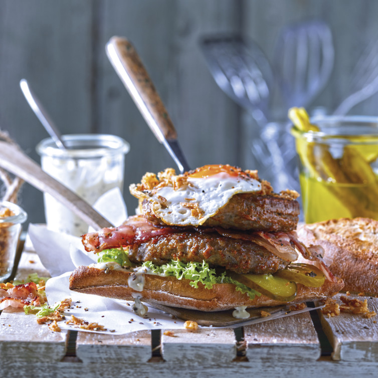 Der klassische Burger (nur anders) mit saftigem Hamburger aus Rindfleisch, knusprigem Bacon und ganz raffiniert - mit einem Spiegelei. Wir setzen der Burger-Füllung kein Limit und wachsen hoch hinaus!