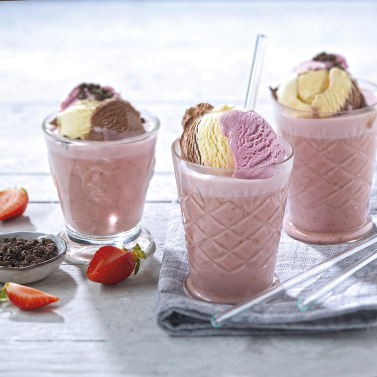 Die Erdbeermilch in Gläser füllen und mit je einer Kugel Eis und mit einem Glastrinkhalm servieren.