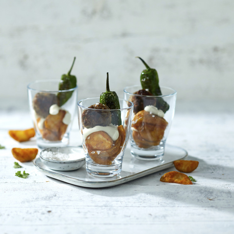 Jeweils 3 Kartoffel-Wedges in ein Glas schichten, mit Aioli, Mini-Frikadelle und Pimentos de Padron fortfahren. Mit grobem Meersalz bestreuen.