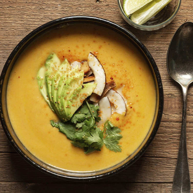 Möhrencremesuppe mit Avocado-Kokosnuss-Topping