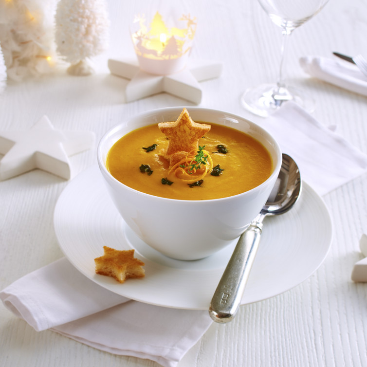 Für die Croutons das Toastbrot mit einem Sterne-Ausstecher ausstechen. Dann den Knoblauch abziehen und eine Pfanne damit ausreiben. Die Brotsternchen in reichlich Butter in der heißen Pfanne rundherum goldbraun rösten. Auf Küchenkrepp abtropfen lassen und beiseite stellen.
