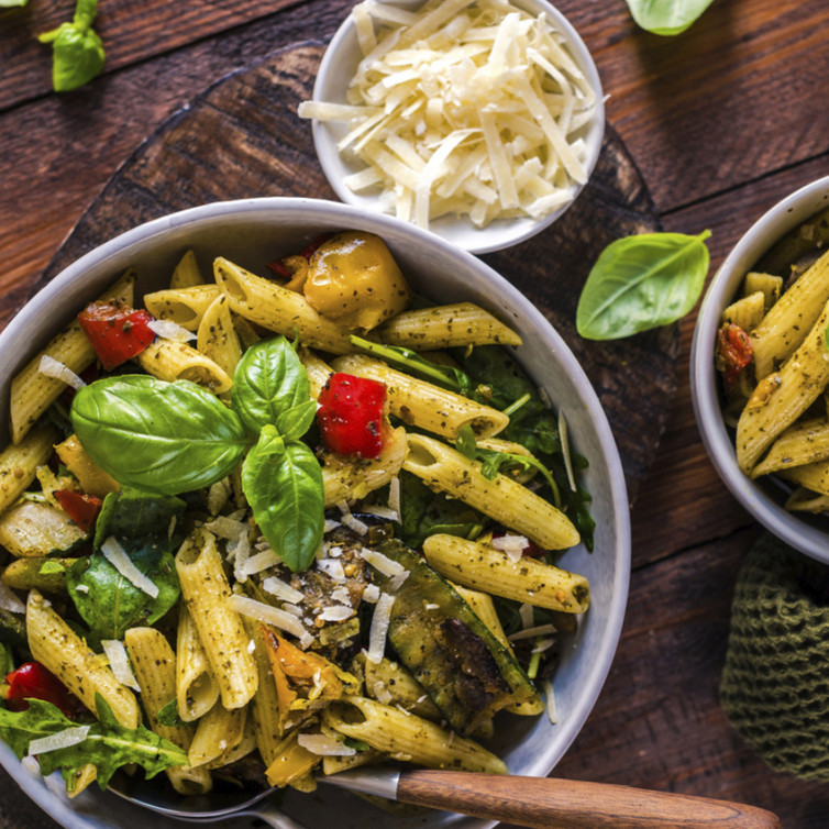 Das Pesto sowie das Hähnchen und Grillgemüse hinzufügen. Alles miteinander vermengen und ggfs. mit Salz und Pfeffer abschmecken.