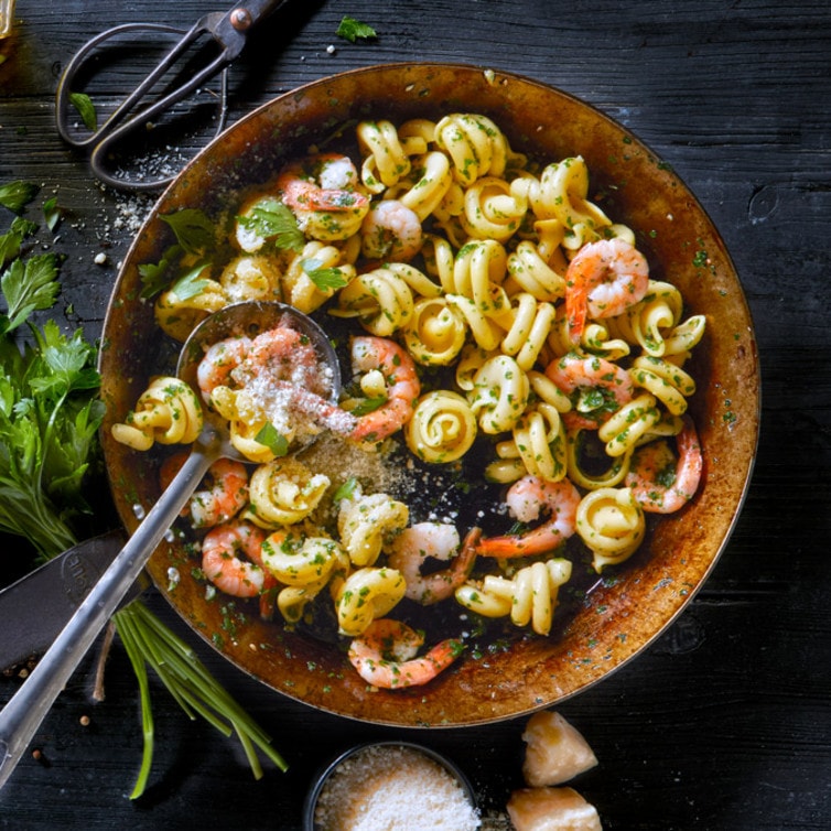 Giet de pasta af en voeg deze toe aan de pan met garnalen. Hussel alles goed door elkaar en schep op voorverwarmde borden. Serveer met geraspte pecorino en vers gemalen peper.