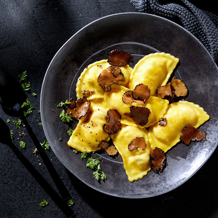 Nach der Garzeit der Pasta diese mit der Schaumkelle heraus nehmen, direkt in dem Trüffelcarpaccio schwenken und direkt servieren.