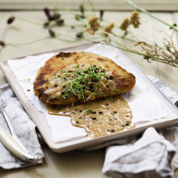 Die Sauce über die Schnitzel geben. Mit Kresse dekoriert servieren.