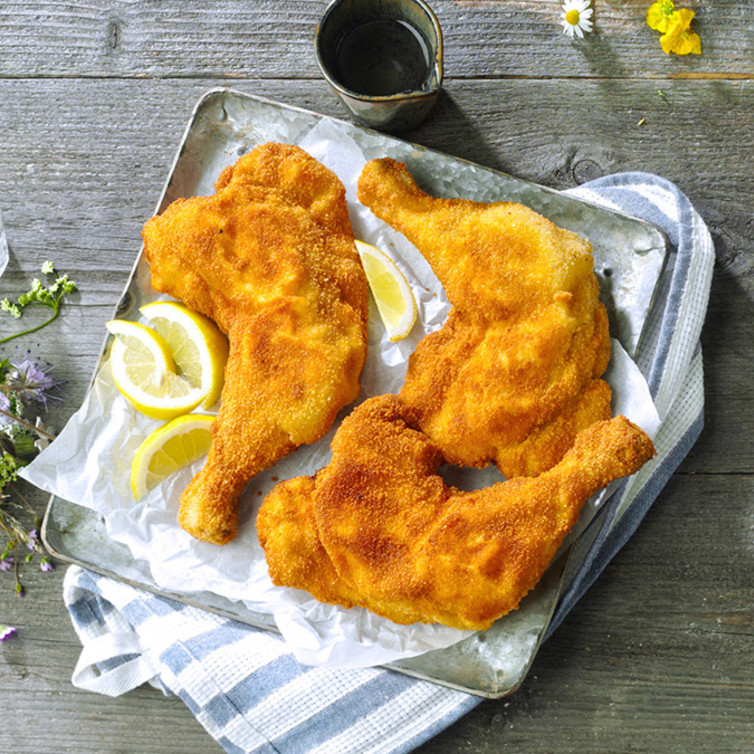 Die Eier aufschlagen und verquirlen. In einer Pfanne das Fett erhitzen. Die Keulen nacheinander im Mehl, Ei und dann im Paniermehl wälzen. In das heiße Fett geben und bei mittlerer Hitze braten. Dabei immer wieder wenden.