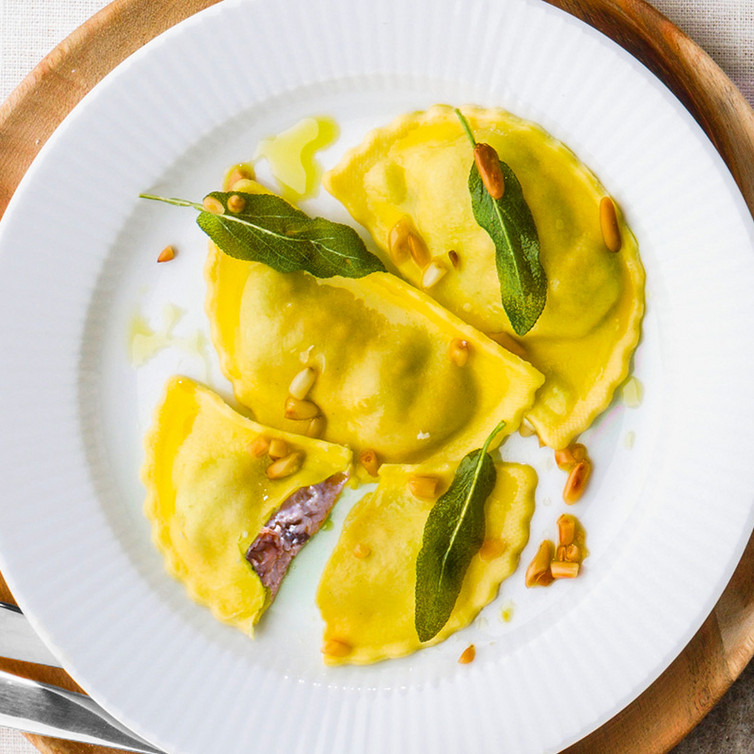 Währenddessen in einer Pfanne Olivenöl erhitzen und die Salbeiblätter darin kurz anbraten. Die gegarten Panzerotti mit der Schaumkelle aus dem Topf heben und direkt in die Pfanne mit dem Salbei- Olivenöl geben. Vorsichtig schwenken, sofort auf Tellern anrichten und mit den gerösteten Pinienkernen bestreuen.